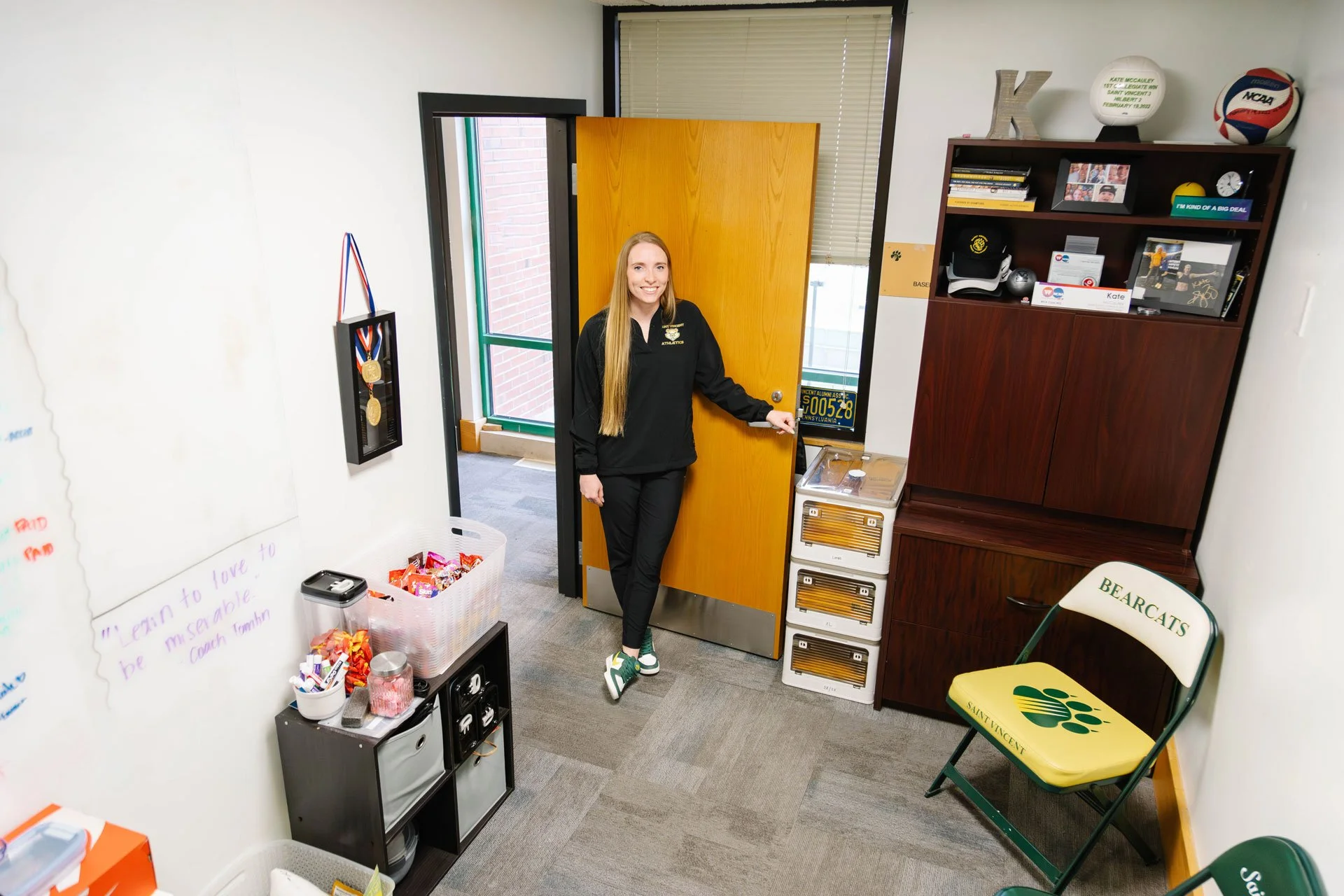 For Kate McCauley, C’15, her office is a vibrant reflection of her dual roles as both men’s volleyball coach and game day operations manager. And while she might describe her office as “organized chaos,” her purpose is crystal clear: recreate the unforgettable experiences she cherished as a student-athlete for today’s Bearcats, whether that’s making sure a lacrosse match runs smoothly, coaching her team all the way to a championship tournament, or making sure her candy bin is fully stocked for anyone who might need a sugar fix to brighten their day just a bit. Though part of a small percentage of women coaching men’s sports, Kate takes on every challenge with unmatched confidence and determination. She embraces her role fully and brings a signature style to the court that includes coaching in heels—a fitting symbol of her determination to make a strong, visible impact in a traditionally male-dominated field.